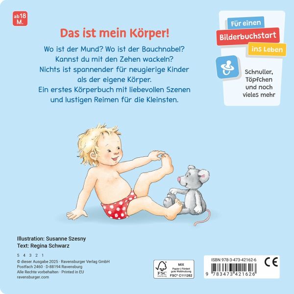 Für Kleinkinder ist es unglaublich spannend, den eigenen Körper zu entdecken: Mit den Augen kann man sehen, mit den Händen klatschen und mit den Ohren hören. Von Kopf bis Fuß werden in diesem Buch alle wichtigen Körperteile vorgestellt. Kurze Reime erklären, was man mit der Nase, den Zehen und Fingern so alles machen kann. Ein Pappbilderbuch, dass liebevoll und kindgerecht Wissen über den eigenen Körper vermittelt.