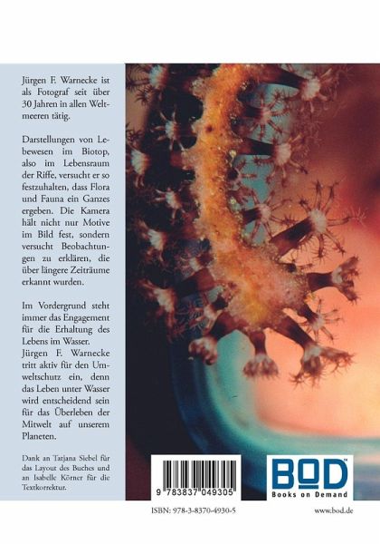 Jürgen F. Warnecke ist als Fotograf seit über 30 Jahren in allen Weltmeeren tätig.Darstellungen von Lebewesen im Biotop, also im Lebensraum der Riffe, versucht er so festzuhalten, dass Flora und Fauna ein Ganzes ergeben. Die Kamera hält nicht nur Motive im Bild fest, sondern versucht Beobachtungen zu erklären, die über längere Zeiträume erkannt wurden.Im Vordergrund steht immer das Engagement für die Erhaltung des Lebens im Wasser. Jürgen F. Warnecke tritt aktiv für den Umweltschutz ein, denn das Leben unter Wasser wird entscheidend sein für das Überleben der Mitwelt auf unserem Planeten.