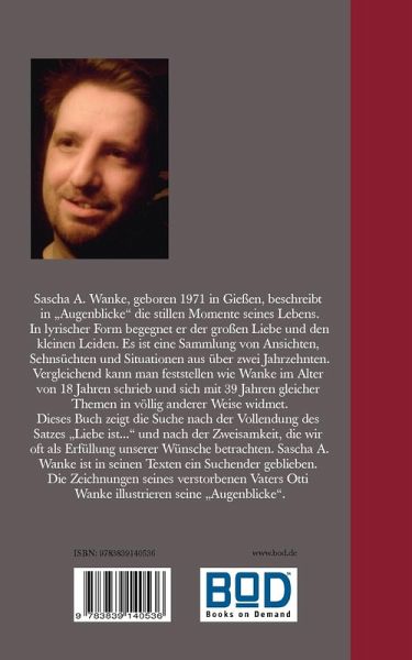 Sascha A. Wanke, geboren 1971 in Gießen, beschreibt in "Augenblicke" die stillen Momente seines Lebens. In lyrischer Form begegnet er der großen Liebe und den kleinen Leiden. Es ist eine Sammlung von Ansichten, Sehnsüchten und Situationen aus über zwei Jahrzehnten. Vergleichend kann man feststellen wie Wanke im Alter von 18 Jahren schreibt und sich mit 39 Jahren der gleichen Thematik völlig unterschiedlich widmet. Dieses Buch zeigt die Suche nach der Vollendung des Satzes "Liebe ist..." und nach Zweisamkeit, die wir oft als Erfüllung unserer Wünsche betrachten. Sascha A. Wanke ist in seinen Texten ein Suchender geblieben. Die Zeichnungen seines verstorbenen Vaters Otti Wanke illustrieren dieses Buch.