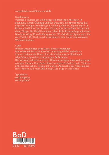 Augenblicke (ver)führen zur Welt. ErzählungenVerlorene Mützen; ein Zollbetrug; ein Brief ohne Absender. In Spannung stehen Ökologie und das Duschen. Ein Spesenbetrug hat ungeahnte Folgen. Metallkugeln werden gefunden. Begegnungen im blauen Abteil. Ein Tanz in einer Kirche; eine Butterfahrt. Warten auf einer Klippe. Ein Unfall in einem Labor. Fallschirmsprünge auf einem Betriebsausflug. Entscheidungen einer KI. Grünliche Lippen und eine rote Tasche. Die Suche nach dem Namen. Eine Liebe wird realisiert. Weihnachtsglanz.LyrikWörter entschlüpfen dem Mund; Punkte begrenzen. Menschen reichen sich Kirschen; eine karge Nähe umhüllt sie.Sterne irritieren die Natur. Sind sie Hehler unserer Illusionen?Algorithmen gestalten transhumane Reflexionen.Die Vernunft schwebt nur leise. Uhren schweigen; Züge verharren auf rostigen Gleisen. Eine Barke fährt zu ewigen Gründen; in der Tiefe ist unbekanntes Leben. Heimat im Garten. Angesichts des Todes neigen sich Tapeten. Ein roter Milan fliegt. Die Lage ist verdichtet."gegebenessucht eigenessucht gründe"