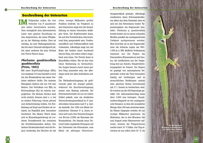 Der Augenfleck-Taggecko gehört zu der Gattung der Phelsumen. Die Beliebtheit dieser Gattung liegt nicht nur in der relativ einfachen Pflege vieler Arten und in der großen Vermehrungsfreudigkeit begründet, sondern auch in der hohen optischen Attraktivität. So auch bei dem Augenfleck-Taggecko.-Systematik und Körperbau-Die faszinierende Biologie: Aus dem Leben des Augenfleck-Taggeckos-Alle Informationen zur artgerechten Haltung: Vom geeigneten Terrarium über Einrichtung und Technik bis hin zur Fütterung-Erfolgreich nachzüchten: Paarungsstimulation, Inkubation der Eier und Aufzucht der Jungtiere-Problemlösungen: Wie man die häufigsten Fehler bei der Pflege vermeidet, und wie man kranken Tieren helfen kann-Brillante Fotos