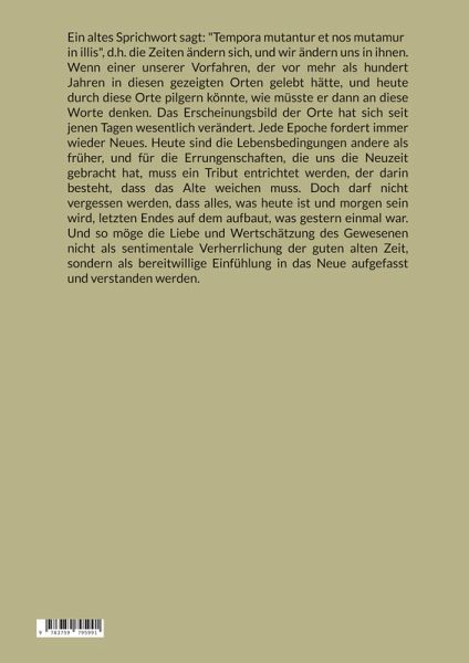 Ein altes Sprichwort sagt: "Tempora mutantur et nos mutamur in illis", d.h. die Zeiten ändern sich, und wir ändern uns in ihnen. Wenn einer unserer Vorfahren, der vor mehr als hundert Jahren in diesen gezeigten Orten gelebt hätte, und heute durch diese Orte pilgern könnte, wie müsste er dann an diese Worte denken. Das Erscheinungsbild der Orte hat sich seit jenen Tagen wesentlich verändert. Jede Epoche fordert immer wieder Neues. Heute sind die Lebensbedingungen andere als früher, und für die Errungenschaften, die uns die Neuzeit gebracht hat, muss ein Tribut entrichtet werden, der darin besteht, dass das Alte weichen muss. Doch darf nicht vergessen werden, dass alles, was heute ist und morgen sein wird, letzten Endes auf dem aufbaut, was gestern einmal war. Und so möge die Liebe und Wertschätzung des Gewesenen nicht als sentimentale Verherrlichung der guten alten Zeit, sondern als bereitwillige Einfühlung in das Neue aufgefasst und verstanden werden.