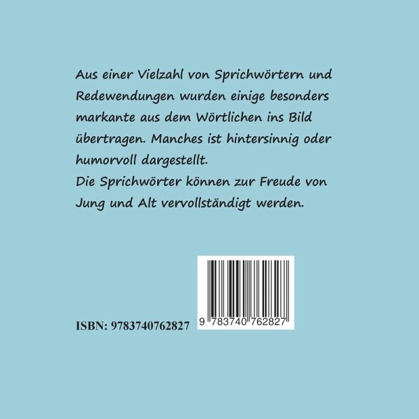 Dieser Bildband wählt aus der Vielzahl von Sprichwörtern und Redewendungen einige besonders markante aus und überträgt sie aus dem Wörtlichen ins Bildhafte. Manches ist hintersinnig oder humorvoll dargestellt. Wer die Sprüche kennt, kann zum Bild den Text vervollständigen.