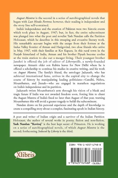 August Mantra is the second in a series of autobiographical novels that began with Last Hindu Fortress; however, their reading is independent and the story line self-contained. India's independence and the creation of Pakistan were two historic events which took place in August, 1947; but, in fact, the entire subcontinent was plunged into what the poet and novelist Yash Nandan calls the Partition Holocaust, which he describes in this sweeping and evocative literary work. His remarkable account begins with the escape from their fortress at the Indus Valley frontier of Atman and Harigovind, two close friends who arrive in May, 1947, with their families at Kot Kapura. In this rural town in the Punjab hinterland of India, Atman and his brother Piyush become coolies at the train station to eke out a meager living. Their youngest brother Janshri is offered the job of editor of Libertyville, a newly-founded newspaper. Atman's older son Kabira leaves for New Delhi where he is offered a scholarship to continue his studies in creative writing, and his work on August Mantra. The family's friend, the astrologer Jadunath, who has achieved international fame, arrives in the capital city to change the course of history by manipulating leading politicians-Gandhi, Nehru, Mountbatten, and Jinnah-who are engaged in marathon negotiations on India's independence and its partition. Jadunath twists Mountbatten's arm through his vision of a bleak and tragic future if India was not awarded freedom soon, forcing him to chant the August Mantra of India's freed no later than August of that year, warning Mountbatten this will avoid a greater tragedy to befall the subcontinent. Nandan draws on his personal experience and the depth of knowledge to create a compelling story about a complex, fascinating epoch in Indian history.