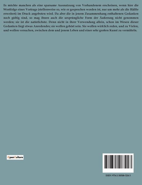Es möchte manchen als eine sparsame Ausnutzung von Vorhandenem erscheinen, wenn hier die Wortfolge eines Vortrags (stellenweise so, wie er gesprochen worden ist, nur um mehr als die Hälfte erweitert) im Druck angeboten wird. Da aber die in jenem Zusammenhang enthaltenen Gedanken noch gültig sind, so mag ihnen auch die ursprüngliche Form der Äußerung nicht genommen werden; sie ist die natürlichste. Denn nicht in ihrer Verwendung allein, schon im Wesen dieser Gedanken liegt etwas Anredendes; sie wollen gehört sein. Sie wollen wirklich reden, und zu Vielen, und wollen versuchen, zwischen dem und jenem Leben und einer sehr großen Kunst zu vermitteln.