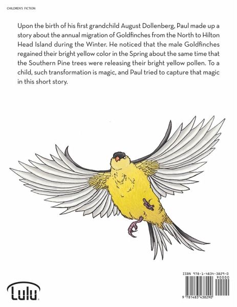 Upon the birth of his first grandchild August Dollenberg, Paul made up a story about the annual migration of Goldfinches from the North to Hilton Head Island during the Winter. He noticed that the male Goldfinches regained their bright yellow color in the Spring about the same time that the Southern Pine trees were releasing their bright yellow pollen. To a child, such transformation is magic, and Paul tried to capture that magic in this short story.