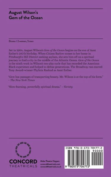 "Set in 1904, August Wilson's Gem of the Ocean begins on the eve of Aunt Esther's 287th birthday. When Citizen Barlow comes to her Pittsburgh's Hill District home seeking asylum, she sets him off on a spiritual journey to find a city in the middle of the Atlantic Ocean."--Publisher's description.