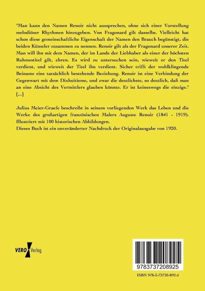 Julius Meier-Graefe beschreibt in seinem vorliegenden Werk das Leben und die Werke des großartigen französischen Malers Auguste Renoir (1841 - 1919). Illustriert mit 100 historischen Abbildungen.