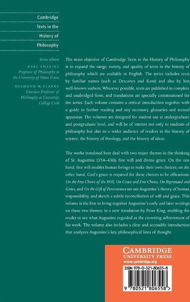 The works translated here deal with two major themes in the thinking of St Augustine (354-430): free will and divine grace. On the one hand, free will enables human beings to make their own choices; on the other hand, God's grace is required for these choices to be efficacious. 'On the Free Choice of the Will', 'On Grace and Free Choice', 'On Reprimand and Grace' and 'On the Gift of Perseverance' set out Augustine's theory of human responsibility, and sketch a subtle reconciliation of will and grace. This volume is the first to bring together Augustine's early and later writings on these two themes, in a new translation by Peter King, enabling the reader to see what Augustine regarded as the crowning achievement of his work. The volume also includes a clear and accessible introduction that analyzes Augustine's key philosophical lines of thought.