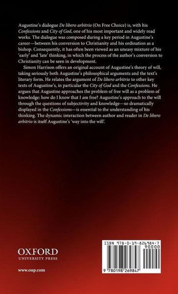 An original account of Augustine's theory of will, based on a close reading of his pivotal and fundamental text, the dialogue On Free Choice. Simon Harrison takes Augustine's philosophical arguments and literary form seriously and so reveals a way of thinking about the will that is grounded in the individual reader's response. He shows the centrality of Augustine's philosophical method, his 'way in to the will', as opposed to the construction of a monolithic 'theory of will'. Harrison relates the argument of On Free Choice to other key texts of Augustine's, in particular the City of God and the Confessions, and rehabilitates a widely read but often misinterpreted book to show the importance of Augustine as a major philosopher.