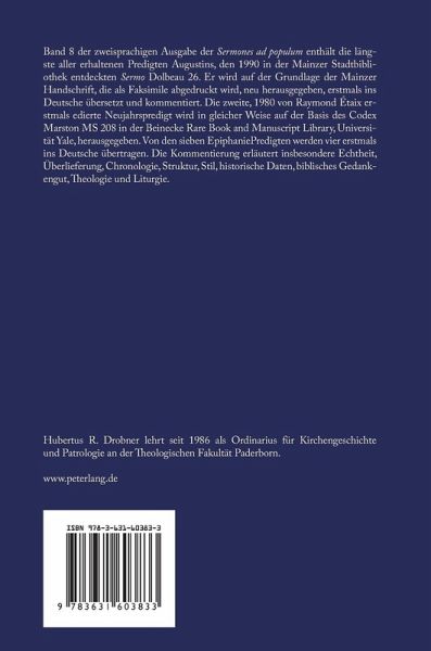 Band 8 der zweisprachigen Ausgabe der Sermones ad populum enthält die längste aller erhaltenen Predigten Augustins, den 1990 in der Mainzer Stadtbibliothek entdeckten Sermo Dolbeau 26. Er wird auf der Grundlage der Mainzer Handschrift, die als Faksimile abgedruckt wird, neu herausgegeben, erstmals ins Deutsche übersetzt und kommentiert. Die zweite, 1980 von Raymond Étaix erstmals edierte Neujahrspredigt wird in gleicher Weise auf der Basis des Codex Marston MS 208 in der Beinecke Rare Book and Manuscript Library, Universität Yale, herausgegeben. Von den sieben Epiphanie-Predigten werden vier erstmals ins Deutsche übertragen. Die Kommentierung erläutert insbesondere Echtheit, Überlieferung, Chronologie, Struktur, Stil, historische Daten, biblisches Gedankengut, Theologie und Liturgie.