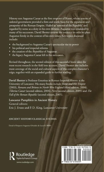 History sees Augustus Caesar as the first emperor of Rome, whose system of ordered government provided a firm and stable basis for the expansion and prosperity of the Roman Empire. Hailed as 'restorer of the Republic' and regarded by some as a deity in his own lifetime, Augustus was emulated by many of his successors. David Shotter reviews the evidence in order to place Augustus firmly in the context of his own times. Key topics discussed include: * the background to Augustus Caesar's spectacular rise to power * his political and imperial reforms * the creation of the "Respublica "of Augustus * the legacy Augustus Caesar left to his successors. Revised throughout, the second edition of this successful book takes the most recent research in the field into account. David Shotter also includes more coverage of the social and cultural aspects of this complex character's reign together with an expanded guide to further reading.