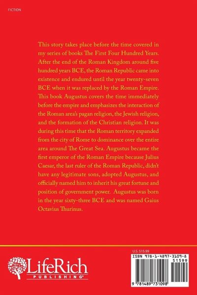 This story takes place before the time covered in my series of books The First Four Hundred Years. After the end of the Roman Kingdom around five hundred years BCE, the Roman Republic came into existence and endured until the year twenty-seven BCE when it was replaced by the Roman Empire. This book Augustus covers the time immediately before the empire and emphasizes the interaction of the Roman area's pagan religion, the Jewish religion, and the formation of the Christian religion. It was during this time that the Roman territory expanded from the city of Rome to dominance over the entire…mehr