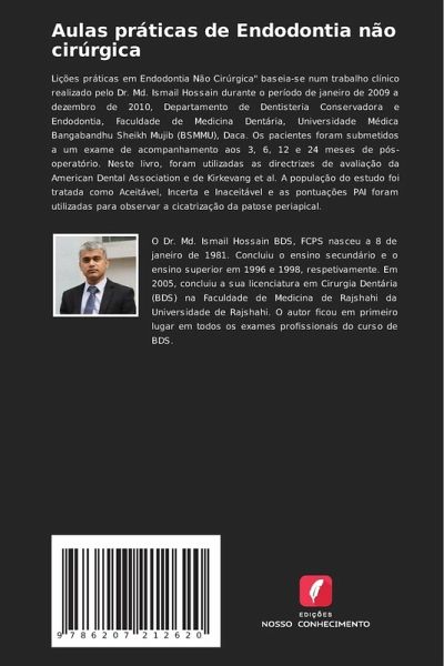 Lições práticas em Endodontia Não Cirúrgica" baseia-se num trabalho clínico realizado pelo Dr. Md. Ismail Hossain durante o período de janeiro de 2009 a dezembro de 2010, Departamento de Dentisteria Conservadora e Endodontia, Faculdade de Medicina Dentária, Universidade Médica Bangabandhu Sheikh Mujib (BSMMU), Daca. Os pacientes foram submetidos a um exame de acompanhamento aos 3, 6, 12 e 24 meses de pós-operatório. Neste livro, foram utilizadas as directrizes de avaliação da American Dental Association e de Kirkevang et al. A população do estudo foi tratada como Aceitável, Incerta e Inaceitável e as pontuações PAI foram utilizadas para observar a cicatrização da patose periapical.