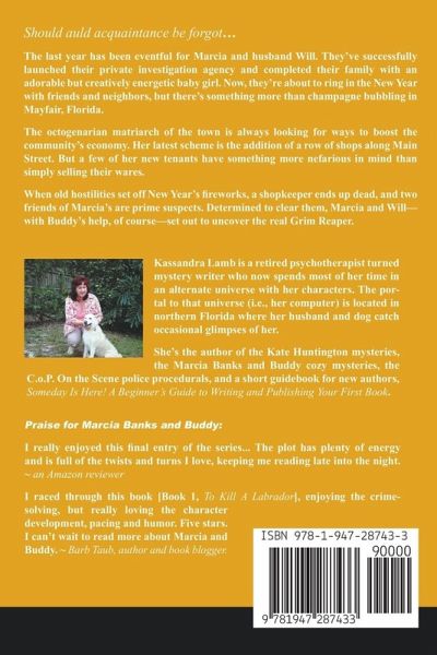 Should auld acquaintance be forgot… The last year has been eventful for Marcia and husband Will. They've successfully launched their private investigation agency and completed their family with an adorable but creatively energetic baby girl. Now, they're about to ring in the New Year with friends and neighbors, but there's something more than champagne bubbling in Mayfair, Florida. The octogenarian matriarch of the town is always looking for ways to boost the community's economy. Her latest scheme is the addition of a row of shops along Main Street. But a few of her new tenants have something more nefarious in mind than simply selling their wares. When old hostilities set off New Year's fireworks, a shopkeeper ends up dead, and two friends of Marcia's are the prime suspects. Determined to clear them, Marcia and Will-with Buddy's help, of course-set out to uncover the real Grim Reaper.
