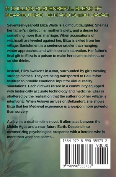 Seventeen-year-old Eliza Waite is a difficult daughter. She has her father's intellect, her mother's piety, and a desire for something more than marriage. When accusations of witchcraft are leveled against her, Eliza is exiled. Bereft of her community, starvation is certain. Her father's final gift is a poison to make her death painless... or so she thinks. Instead, Eliza awakens in a van, surrounded by girls wearing strange clothes. They are being transported to Bellumfort Institute. The Institute's mission is to reclaim history via high-fidelity virtual simulations. To do so, they establish communities where girls are raised in historically accurate conditions - no matter how dangerous. Eliza's psyche fragments when confronted with evidence Bellumfort withheld life-saving medicine from her siblings. When Aulisyn arrives, she teaches Eliza that her Medieval experience is a weapon. Is Eliza strong enough to wield it? Aulisyn is a dual-timeline novel. It alternates between the Middle Ages and a near-future Earth. Descend into mesmerizing psychological suspense with a heroine who is more than what she seems...