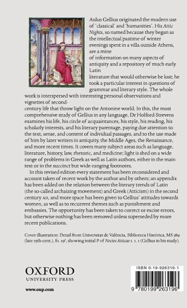 Aulus Gellius originated the modern use of 'classical' and 'humanities'. His Attic Nights, so named because they began as the intellectual pastime of winter evenings spent in a villa outside Athens, are a mine of information on many aspects of antiquity and a repository of much early Latin literature which would otherwise be lost; he took a particular interest in questions of grammar and literary style. The whole work is interspersed with interesting personal observations and vignettes of second-century life that throw light on the Antonine world. In this, the most comprehensive study of Gellius in any language, Dr Holford-Strevens examines his life, his circle of acquaintances, his style, his reading, his scholarly interests, and his literary parentage, paying due attention to the text, sense, and content of individual passages, and to the use made of him by later writers in antiquity, the Middle Ages, the Renaissance, and more recent times. It covers many subject areas such as language, literature, history, law, rhetoric, medicine; light is shed on a wide range of problems in Greek as well as Latin authors, either in the main text or in the succinct but wide-ranging footnotes. In this revised edition every statement has been reconsidered and account taken of recent work by the author and by others; an appendix has been added on the relation between the literary trends of Latin (the so-called archaizing movement) and Greek (Atticism) in the second century AD, and more space has been given to Gellius' attitudes towards women, as well as to recurrent themes such as punishment and embassies. The opportunity has been taken to correct or excise errors, but otherwise nothing has been removed unless superseded by more recent publications.