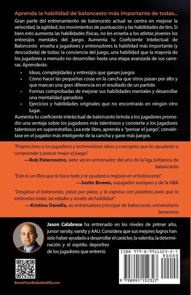 Aprenda la habilidad de baloncesto más importante de todas... Gran parte del entrenamiento de baloncesto actual se centra en mejorar la velocidad, la agilidad, los movimientos de puntuación y las habilidades de tiro. Si bien esto aumenta las habilidades físicas, no les enseña a los atletas jóvenes los entresijos mentales del juego. Aumenta tu Coeficiente Intelectual de Baloncesto enseña a jugadores y entrenadores la habilidad más importante (y descuidada) de todas: la conciencia del juego, una habilidad que la mayoría de los jugadores a menudo no desarrollan hasta una etapa avanzada de sus carreras. Aprenderás:Ideas, complejidades y entresijos que ganan juegos Cómo hacer las pequeñas cosas en la cancha que otros pasan por alto y que marcan una gran diferencia en el resultado de un partido Formas comprobadas de mejorar sus habilidades mentales y desarrollar una mentalidad ganadora Ejercicios y habilidades originales que no encontrarás en ningún otro lugar Aumenta tu coeficiente intelectual de baloncesto brinda a los jugadores promedio una ventaja sobre los jugadores más talentosos y convierte a los jugadores talentosos en superestrellas. Lea este libro, aprenda a "pensar el juego", conviértase en el jugador más inteligente de la cancha y gane más juegos.