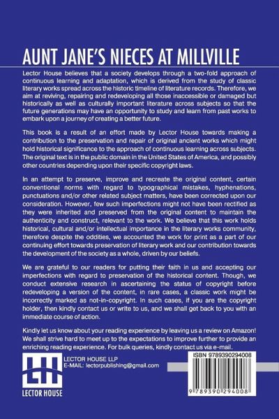 Aunt Jane's Nieces At Millville This book is a result of an effort made by us towards making a contribution to the preservation and repair of original classic literature. In an attempt to preserve, improve and recreate the original content, we have worked towards: 1. Type-setting & Reformatting: The complete work has been re-designed via professional layout, formatting and type-setting tools to re-create the same edition with rich typography, graphics, high quality images, and table elements, giving our readers the feel of holding a 'fresh and newly' reprinted and/or revised edition, as opposed to other scanned & printed (Optical Character Recognition - OCR) reproductions. 2. Correction of imperfections: As the work was re-created from the scratch, therefore, it was vetted to rectify certain conventional norms with regard to typographical mistakes, hyphenations, punctuations, blurred images, missing content/pages, and/or other related subject matters, upon our consideration. Every attempt was made to rectify the imperfections related to omitted constructs in the original edition via other references. However, a few of such imperfections which could not be rectified due to intentional\unintentional omission of content in the original edition, were inherited and preserved from the original work to maintain the authenticity and construct, relevant to the work. We believe that this work holds historical, cultural and/or intellectual importance in the literary works community, therefore despite the oddities, we accounted the work for print as a part of our continuing effort towards preservation of literary work and our contribution towards the development of the society as a whole, driven by our beliefs. We are grateful to our readers for putting their faith in us and accepting our imperfections with regard to preservation of the historical content. HAPPY READING!