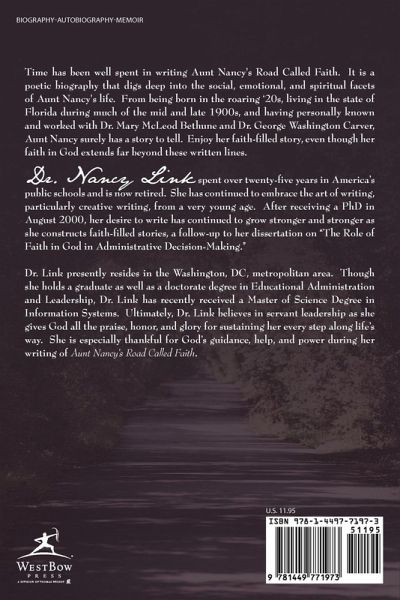 Time has been well spent in writing Aunt Nancy's Road Called Faith. It is a poetic biography that digs deep into the social, emotional, and spiritual facets of Aunt Nancy's life. From being born in the roaring '20s, living in the state of Florida during much of the mid and late 1900s, and having personally known and worked with Dr. Mary McLeod Bethune and Dr. George Washington Carver, Aunt Nancy surely has a story to tell. Enjoy her faith-filled story, even though her faith in God extends far beyond these written lines.