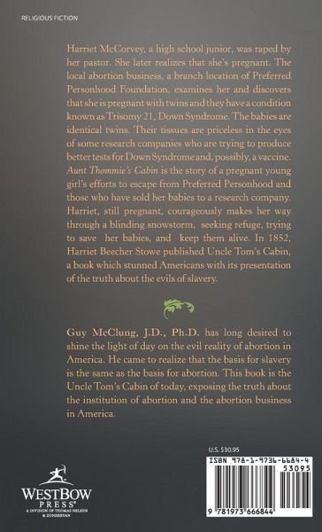 Harriet McCorvey, a high school junior, was raped by her pastor. She later realizes that she's pregnant. The local abortion business, a branch location of Preferred Personhood Foundation, examines her and discovers that she is pregnant with twins and they have a condition known as Trisomy 21, Down Syndrome. The babies are identical twins. Their tissues are priceless in the eyes of some research companies who are trying to produce better tests for Down Syndrome and, possibly, a vaccine. Aunt Thommie's Cabin is the story of a pregnant young girl's efforts to escape from Preferred Personhood and those who have sold her babies to a research company. Harriet, still pregnant, courageously makes her way through a blinding snowstorm, seeking refuge, trying to save her babies, and keep them alive. In 1852, Harriet Beecher Stowe published Uncle Tom's Cabin, a book which stunned Americans with its presentation of the truth about the evils of slavery.
