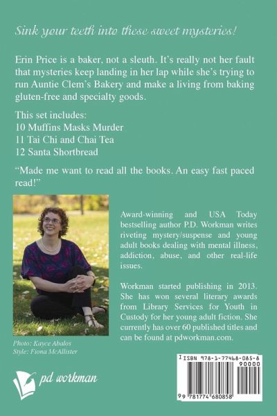 From USA Today Bestselling Author, P.D. Workman!Sink your teeth into these sweet mysteries! Erin Price is a baker, not a sleuth. It's really not her fault that mysteries keep landing in her lap while she's trying to run Auntie Clem's Bakery and make a living from baking gluten-free and specialty goods. This set includes: 10 Muffins Masks Murder 11 Tai Chi and Chai Tea 12 Santa Shortbread Muffins Masks Murder This time, Erin is not the suspect in a murder investigation, her sweetheart Officer Terry Piper is. Could he have been pushed too far by drug runner Bo Biggles? Did he cross the line? Or is it someone else in the community, someone who might be close to Erin? Tai Chi and Chai Tea Mary Lou is delighted to have Campbell home for Thanksgiving dinner, but less than thrilled with his companion. Before they can get to the bakery-fresh desserts, they are joined by an uninvited guest, the kind that comes with a warrant. Santa Shortbread Somebody is stealing Christmas gifts from the Bald Eagle Falls children. At the rate that presents are disappearing, there soon won't be a gift left in Whoville. Err, Bald Eagle Falls. ¿¿¿¿¿¿¿¿¿¿ Made me want to read all the books. An easy fast paced read! Like baking mysteries? Cats, dogs, and other pets? Award-winning and USA Today Bestselling Author P.D. Workman brings readers to small town Bald Eagle Falls for culinary cozy mysteries to be solved by gluten-free baker Erin Price and her friends.Have your gluten-free cake and eat it too. Dig into this sweet treat now!