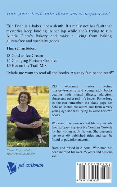 From USA Today Bestselling Author, P.D. Workman! Sink your teeth into these sweet mysteries! Erin Price is a baker, not a sleuth. It's really not her fault that mysteries keep landing in her lap while she's trying to run Auntie Clem's Bakery and make a living from baking gluten-free and specialty goods. Sink your teeth into these sweet mysteries! 13 Cold as Ice Cream 14 Changing Fortune Cookies 15 Hot on the Trail Mix This set includes: 13 Cold as Ice Cream It's a CO2 cook-off! Chef Kirschoff and Vic's friends from the Alaskan cruise are back for a carbonation contest, with Erin and Vic acting as two of the judges. It's fizzy, it's fun, what could possibly go wrong? 14 Changing Fortune Cookies The baker turned sleuth is hard at work once more, trying to run her business while at the same time tracking down a missing boy. Is he missing by his own choice, as the police suggest, or has he been kidnapped and held against his will? 15 Hot on the Trail Mix When Vic and Willie discover human remains in a cave they are exploring, the shock waves are felt throughout Bald Eagle Falls. When Willie falls under suspicion, Erin has to do more than just make her awesome new granola bars and trail mix. ¿¿¿¿¿¿¿¿¿¿ This book is everything I expect of Ms. Workman. The characters are well developed and believable, the plot is deliciously twisty, and the writing exceptional. Like baking mysteries? Cats, dogs, and other pets? Award-winning and USA Today Bestselling Author P.D. Workman brings readers to small town Bald Eagle Falls for culinary cozy mysteries to be solved by gluten-free baker Erin Price and her friends. Have your gluten-free cake and eat it too. Dig into this sweet treat now!