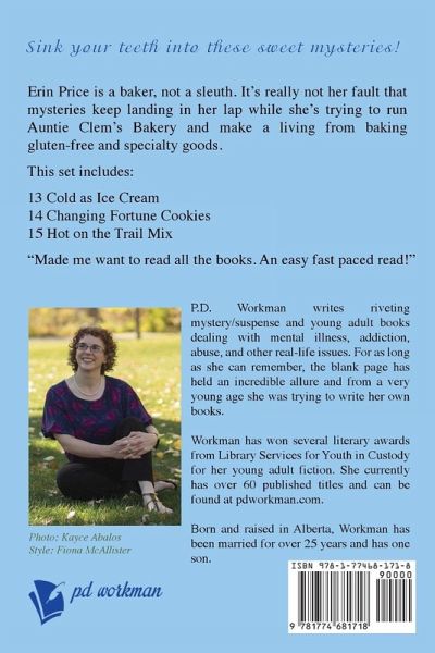 From USA Today Bestselling Author, P.D. Workman! Sink your teeth into these sweet mysteries! Erin Price is a baker, not a sleuth. It's really not her fault that mysteries keep landing in her lap while she's trying to run Auntie Clem's Bakery and make a living from baking gluten-free and specialty goods. Sink your teeth into these sweet mysteries! 13 Cold as Ice Cream 14 Changing Fortune Cookies 15 Hot on the Trail Mix This set includes: 13 Cold as Ice Cream It's a CO2 cook-off! Chef Kirschoff and Vic's friends from the Alaskan cruise are back for a carbonation contest, with Erin and Vic acting as two of the judges. It's fizzy, it's fun, what could possibly go wrong? 14 Changing Fortune Cookies The baker turned sleuth is hard at work once more, trying to run her business while at the same time tracking down a missing boy. Is he missing by his own choice, as the police suggest, or has he been kidnapped and held against his will? 15 Hot on the Trail Mix When Vic and Willie discover human remains in a cave they are exploring, the shock waves are felt throughout Bald Eagle Falls. When Willie falls under suspicion, Erin has to do more than just make her awesome new granola bars and trail mix. ¿¿¿¿¿¿¿¿¿¿ This book is everything I expect of Ms. Workman. The characters are well developed and believable, the plot is deliciously twisty, and the writing exceptional. Like baking mysteries? Cats, dogs, and other pets? Award-winning and USA Today Bestselling Author P.D. Workman brings readers to small town Bald Eagle Falls for culinary cozy mysteries to be solved by gluten-free baker Erin Price and her friends. Have your gluten-free cake and eat it too. Dig into this sweet treat now!