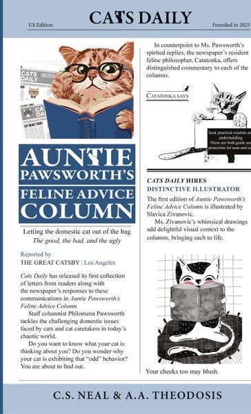 Think an upbeat, energetic Dear Abby with fur, sardonic wit, and literary flourishes. Interested in cat psychology? Would you like to know what your cat really thinks about you? Are you curious about all those odd behaviors your cat exhibits? Auntie Pawsworth explains all. Cats Daily, a newspaper written by cats for cats and for people who are interested in cats, has released a new book, Auntie Pawsworth's Feline Advice Column, a collection of letters submitted to its advice columnist, Philomena Pawsworth, along with her responses to each. A Bengal cat of mixed heritage who was adopted into a large human family, Philomena has spent over a decade studying human beings in a dynamic urban environment requiring novel adaptive behaviors. She mastered the myriad challenges confronting cats in modern America and has built a unique bridge of understanding between the often baffling worlds of the human and the cat. When asked about just a few of the qualities required to successfully navigate these two domains, Philomena suggests curious intelligence, extroversion, determination, mental and physical agility, persistence, a sense of playfulness, and getting a minimum of fifteen hours of sleep each day. Although Philomena credits distinguished Abyssinians in her maternal lineage for gifting her with these traits, she believes all of us can work on cultivating them to various degrees. The earliest known advice column appeared in the year 1690 in a London periodical, The Athenian Mercury, published twice weekly by The Athenian Society. It is reportedly the first periodical that catered specifically to women and the columns covered questions regarding the natural sciences, religion, literature, and politics. In the United States advice columns began to appear in newspapers starting in the 1880s. They dealt primarily with domestic work, such as answering questions related to sewing and recipes. Contemporary life-advice columns mostly respond to questions on relationships and social interactions-the challenges of heart, home, and culture. Dear Abby, a popular syndicated column written by Abigail Van Buren, is a notable example. Although a plethora of online sites treat topics dealing with animals, including cats, Auntie Pawsworth's Feline Advice Column presents a rare opportunity for a cosmopolitan cat, continuing the tradition of columnists recorded in the journals and newspapers of yore, to lend her voice to some of the most pressing issues affecting cats and cat caretakers today. We are also treated to the work of our resident philosopher, Catatonka ("Buffalo Cat"), who offers subsequent commentary--Catatonka Says--to each of the columns. A Native American Shorthair, Catatonka provides restrained counterpoint to Auntie Pawsworth's spirited replies.