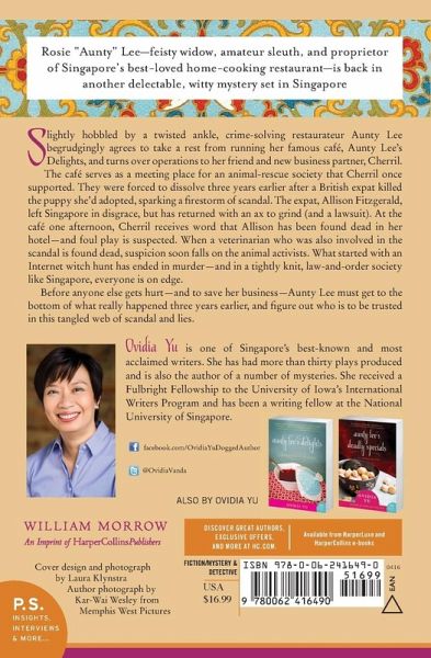 Rosie "Aunty" Lee--feisty widow, amateur sleuth and proprietor of Singapore's best-loved home cooking restaurant--is back in another delectable, witty mystery set in Singapore. Slightly hobbled by a twisted ankle, crime-solving restaurateur Aunty Lee begrudgingly agrees to take a rest from running her famous café, Aunty Lee's Delights, and turns over operations to her friend and new business partner Cherril. The café serves as a meeting place for an animal rescue society that Cherril once supported. They were forced to dissolve three years earlier after a British expat killed the puppy she'd adopted, sparking a firestorm of scandal. The expat, Allison Fitzgerald, left Singapore in disgrace, but has returned with an ax to grind (and a lawsuit). At the café one afternoon, Cherril receives word that Allison has been found dead in her hotel--and foul play is suspected. When a veterinarian, who was also involved in the scandal, is found dead, suspicion soon falls on the animal activists. What started with an internet witch hunt has ended in murder--and in a tightly knit, law-and-order society like Singapore, everyone is on edge. Before anyone else gets hurt--and to save her business--Aunty Lee must get to the bottom of what really happened three years earlier, and figure out who is to be trusted in this tangled web of scandal and lies.