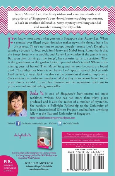 Rosie "Aunty" Lee, the feisty widow and amateur sleuth and proprietor of Singapore's best-loved home-cooking restaurant, is back in another delectable, witty mystery involving scandal and murder among the city's elite Few know more about what goes on in Singapore than Aunty Lee. When a scandal over illegal organ donation makes news, she already has a list of suspects. There's no time to snoop, though?Aunty Lee's Delights is catering a brunch for local socialites Henry and Mabel Sung. Rumor has it that the Sungs' fortune is in trouble, and Aunty Lee wonders if the gossip is true. But soon after arriving at the Sungs', her curiosity turns to suspicion. Why is the guesthouse in the garden locked up?and what's inside? Where is the missing guest of honor? Then Mabel Sung and her son, Leonard, are found dead. The authorities blame it on Aunty Lee's special stewed chicken with buah keluak, a local black nut that can be poisonous if cooked improperly. She's certain the deaths are murder?and that they're somehow linked to the organ donor scandal. To save her business and her reputation, she's got to prove it?and unmask a dangerous killer.