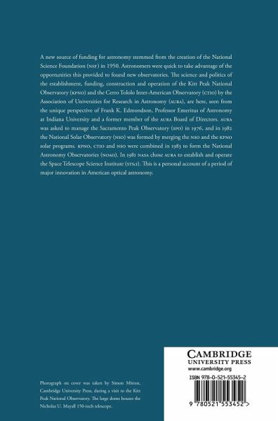 A new source of funding for astronomy stemmed from the creation of the National Science Foundation (NSF) in 1950. Astronomers were quick to take advantage of the opportunities this provided to found new observatories. In this 1997 book, the science and politics of the establishment, funding, construction and operation of the Kitt Peak National Observatory (KPNO) and the Cerro Tololo Inter-American Observatory (CTIO) by the Association of Universities for Research in Astronomy (AURA) are seen from the unique perspective of Frank K. Edmondson, a former member of the AURA board of directors. AURA was asked to manage the Sacramento Peak Observatory (SPO) in 1976, and in 1983 the National Solar Observatory (NSO) was formed by merging the SPO and the KPNO solar programs. In 1981 NASA chose AURA to establish and operate the Space Telescope Science Institute (STScI). This is a personal account of a period of major innovation in American optical astronomy.