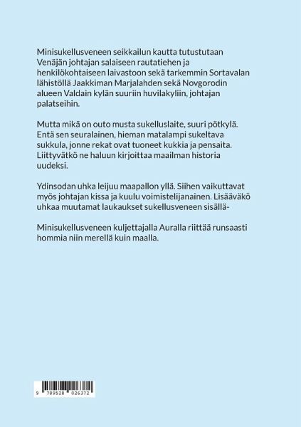 Minisukellusveneen seikkailun kautta tutustutaan Venäjän johtajan salaiseen rautatiehen ja henkilökohtaiseen laivastoon sekä tarkemmin Sortavalan lähistöllä Jaakkiman Marjalahden sekä Novgorodin alueen Valdain kylän suuriin huvilakyliin, johtajan palatseihin. Mutta mikä on outo musta sukelluslaite, suuri pötkylä. Entä sen seuralainen, hieman matalampi sukeltava sukkula, jonne rekat ovat tuoneet kukkia ja pensaita. Liittyvätkö ne haluun kirjoittaa maailman historia uudeksi. Ydinsodan uhka leijuu maapallon yllä. Siihen vaikuttavat myös johtajan kissa ja kuulu voimistelijanainen. Lisääväkö uhkaa muutamat laukaukset sukellusveneen sisällä- Minisukellusveneen kuljettajalla Auralla riittää runsaasti hommia niin merellä kuin maalla.