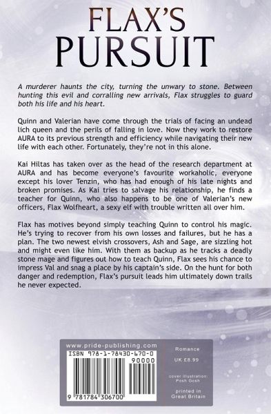 A murderer haunts the city, turning the unwary to stone. Between hunting this evil and corralling new arrivals, Flax struggles to guard both his life and his heart. Quinn and Valerian have come through the trials of facing an undead lich queen and the perils of falling in love. Now they work to restore AURA to its previous strength and efficiency while navigating their new life with each other. Fortunately, they're not in this alone. Kai Hiltas has taken over as the head of the research department at AURA and has become everyone's favourite workaholic, everyone except his lover Tenzin, who has had enough of his late nights and broken promises. As Kai tries to salvage his relationship, he finds a teacher for Quinn, who also happens to be one of Valerian's new officers, Flax Wolfheart, a sexy elf with trouble written all over him. Flax has motives beyond simply teaching Quinn to control his magic. He's trying to recover from his own losses and failures, but he has a plan. The two newest elvish crossovers, Ash and Sage, are sizzling hot and might even like him. With them as backup as he tracks a deadly stone mage and figures out how to teach Quinn, Flax sees his chance to impress Val and snag a place by his captain's side. On the hunt for both danger and redemption, Flax's pursuit leads him ultimately down trails he never expected.