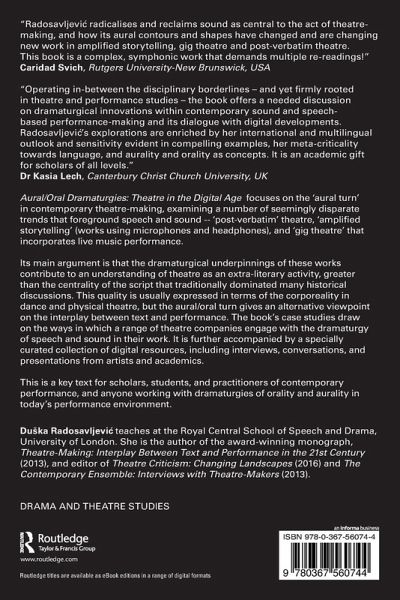 "Duska Radosavljevic's book gives a critically and creatively rigorous and meta-sensitive analysis of dramaturgical intersections between Post-Verbatim, Amplified Storytelling and Gig Theatre. Operating in-between the disciplinary borderlines - and yet firmly rooted in theatre and performance studies - the book offers a needed discussion on dramaturgical innovations within contemporary sound and speech-based performance-making and its dialogue with digital developments. Radosavljevic's explorations are enriched by her international and multilingual outlook and sensitivity evident in compelling examples, her meta-criticality towards language, and aurality and orality as concepts. The book makes an exemplary case - additionally spelt out in its final section - for interdisciplinarity within theatre research methodology and the ethics of dialogue between oneself, research, artists, and the broad theatre community. It is an academic gift for scholars of all levels. It will also be an invaluable addition to reading lists in modules exploring dramaturgy, digital theatre, contemporary performance making, and research methodologies." - Dr Kasia Lech, Canterbury Christ Church University, UK