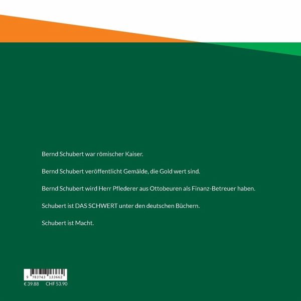 Bernd Schubert war römischer Kaiser.Bernd Schubert veröffentlicht Gemälde, die Gold wert sind.Bernd Schubert wird Herr Pflederer aus Ottobeuren als Finanz-Betreuer haben.Schubert ist DAS SCHWERT unter den deutschen Büchern.Schubert ist Macht.