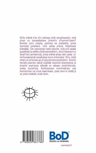 Voiko elämä olla niin vaikeaa vielä nykyaikanakin, että sinun on turvauduttava johonkin yliluonnolliseen? Kenties jokin jumala, pyhimys tai profeetta, jonka tunnistat omaksesi, voisi antaa sinulle helpotusta elämääsi. Ole varovainen ketä rukoilet, sillä voit saada pyytämäsi ja vähän vielä enemmänkin. Jouni Haveson on tavallinen perheenisä, jonka elämä alkaa näin vasta yli nelikymppisenä muodostua hyvin erikoiseksi. Niin, mikä sitten on erikoista tai yliluonnollista kenellekkin. Toisille meistä jokainen päivä sisältää mystisiä kokemuksia ja toiselle suurinosa elämää on vakaan yksitoikkoista, mutta turvallista. Kertomuksen ensimmäinen osa Aurinkoinen vie sinut maailmaan, josta moni ei tiedä ja ne jotka tietävät, eivät kerro.