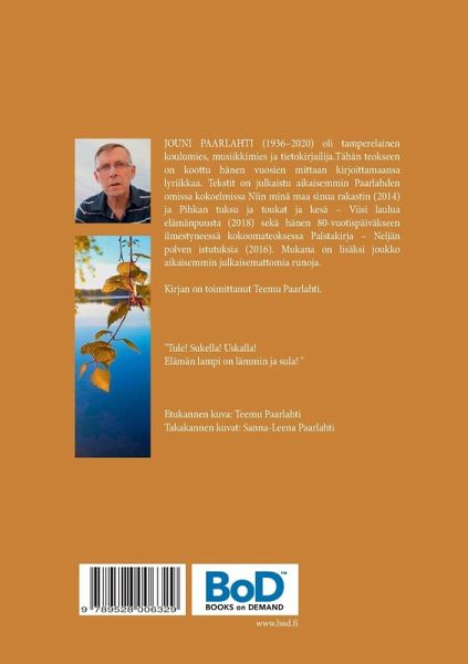Tietokirjailijan koottuja runoja - Jouni Paarlahti (1936-2020) oli tamperelainen koulumies ja tietokirjailija, joka kirjoitti elämän mittaan myös runoja ja laululyriikkaa. Aikaisemmin eri yhteyksissä julkaistuja tekstejä on nyt koottu yhteen ja mukana on myös joukko aikaisemmin julkaisemattomia runoja.