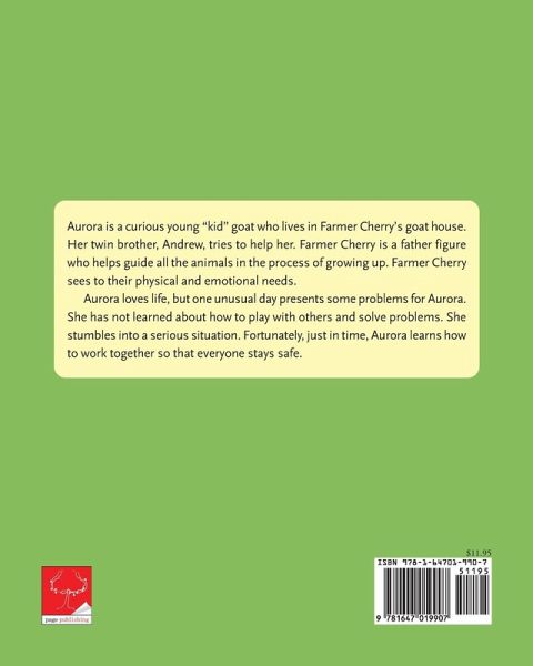 Aurora is a curious young "kid" goat who lives in Farmer Cherry's goat house. Her twin brother, Daniel, tries to help her. Farmer Cherry is a father figure who helps guide all the animals in the process of growing up. Farmer Cherry sees to their physical and emotional needs. Aurora loves life, but one unusual day presents some problems for Aurora. She has not learned about how to play with others and solve problems. She stumbles into a serious situation. Fortunately, just in time, Aurora learns how to work together so that everyone stays safe.
