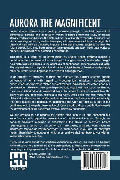 Aurora The Magnificent This book is a result of an effort made by us towards making a contribution to the preservation and repair of original classic literature. In an attempt to preserve, improve and recreate the original content, we have worked towards: 1. Type-setting & Reformatting: The complete work has been re-designed via professional layout, formatting and type-setting tools to re-create the same edition with rich typography, graphics, high quality images, and table elements, giving our readers the feel of holding a 'fresh and newly' reprinted and/or revised edition, as opposed to other scanned & printed (Optical Character Recognition - OCR) reproductions. 2. Correction of imperfections: As the work was re-created from the scratch, therefore, it was vetted to rectify certain conventional norms with regard to typographical mistakes, hyphenations, punctuations, blurred images, missing content/pages, and/or other related subject matters, upon our consideration. Every attempt was made to rectify the imperfections related to omitted constructs in the original edition via other references. However, a few of such imperfections which could not be rectified due to intentional\unintentional omission of content in the original edition, were inherited and preserved from the original work to maintain the authenticity and construct, relevant to the work. We believe that this work holds historical, cultural and/or intellectual importance in the literary works community, therefore despite the oddities, we accounted the work for print as a part of our continuing effort towards preservation of literary work and our contribution towards the development of the society as a whole, driven by our beliefs. We are grateful to our readers for putting their faith in us and accepting our imperfections with regard to preservation of the historical content. HAPPY READING!