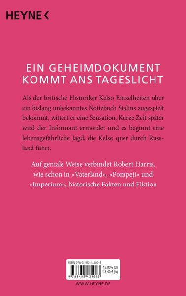 Als der britische Historiker Kelso Einzelheiten über ein bislang unbekanntes Notizbuch Stalins zugespielt bekommt, wittert er eine Sensation. Kurze Zeit später wird der Informant ermordet, und es beginnt eine lebensgefährliche Jagd, die Kelso quer durch Russland führt. Auf geniale Weise verbindet Robert Harris wie schon in "Vaterland" und "Pompeji" historische Fakten und Fiktion.