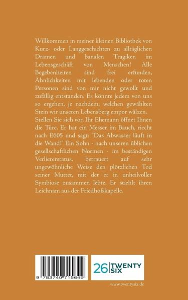 Willkommen in meiner kleinen Bibliothek von Kurz- oder Langgeschichten zu alltäglichen Dramen und banalen Tragiken im Lebensgeschäft von Menschen! Alle Begebenheiten sind frei erfunden, Ähnlichkeiten mit lebenden oder toten Personen sind von mir nicht gewollt und zufällig entstanden. Es könnte jedem von uns so ergehen, je nachdem, welchen gewählten Stein wir unseren Lebensberg empor wälzen. Stellen Sie sich vor, Ihr Ehemann öffnet Ihnen die Türe. Er hat ein Messer im Bauch, riecht nach E605 und sagt: "Das Abwasser läuft in die Wand!" Ein Sohn - nach unseren üblichen gesellschaftlichen Normen - im beständigen Verliererstatus, betrauert auf sehr ungewöhnliche Weise den plötzlichen Tod seiner Mutter, mit der er in unheilvoller Symbiose zusammen lebte. Er stiehlt ihren Leichnam aus der Friedhofskapelle.