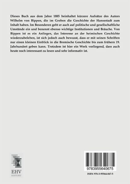 Dieses Buch aus dem Jahre 1885 beinhaltet kürzere Aufsätze des Autors Wilhelm von Bippen, die im Groben die Geschichte der Hansestadt zum Inhalt haben. Im Besonderen geht er auch auf politische und gesellschaftliche Umstände ein und benennt ebenso wichtige Institutionen und Bräuche. Von Bippen ist es ein Anliegen, das Interesse an der heimischen Geschichte wiederzubeleben, ist sich jedoch auch bewusst, dass er mit seinen Schriften nur einen kleinen Einblick in die Bremische Geschichte bis zum frühern 19. Jahrhundert geben kann. Trotzdem ist hier ein Werk vorliegend, dass auch heute noch interessant zu lesen und sehr informativ ist.