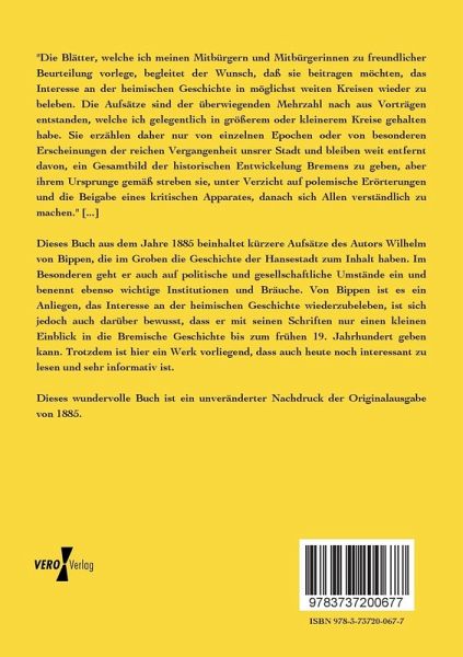 Dieses Buch aus dem Jahre 1885 beinhaltet kürzere Aufsätze des Autors Wilhelm von Bippen, die im Groben die Geschichte der Hansestadt zum Inhalt haben. Im Besonderen geht er auch auf politische und gesellschaftliche Umstände ein und benennt ebenso wichtige Institutionen und Bräuche. Von Bippen ist es ein Anliegen, das Interesse an der heimischen Geschichte wiederzubeleben, ist sich jedoch auch darüber bewusst, dass er mit seinen Schriften nur einen kleinen Einblick in die Bremische Geschichte bis zum frühen 19. Jahrhundert geben kann. Trotzdem ist hier ein Werk vorliegend, dass auch heute noch interessant zu lesen und sehr informativ ist.