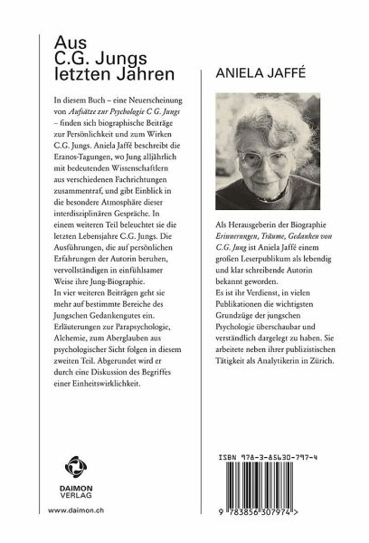 Aus C.G. Jungs letzten JahrenIn diesem Buch - eine Neuerscheinung von Aufsätze zur Psychologie C G. Jungs - finden sich biographische Beiträge zur Persönlichkeit und zum Wirken C.G. Jungs. Aniela Jaffé beschreibt die Eranos-Tagungen, wo Jung alljährlich mit bedeutenden Wissenschaftlern aus verschiedenen Fachrichtungen zusammentraf, und gibt Einblick in die besondere Atmosphäre dieser interdisziplinären Gespräche. In einem weiteren Teil beleuchtet sie die letzten Lebensjahre C.G. Jungs. Die Ausführungen, die auf persönlichen Erfahrungen der Autorin beruhen, vervollständigen in einfühlsamer Weise ihre Jung-Biographie. In vier weiteren Beiträgen geht sie mehr auf bestimmte Bereiche des Jungschen Gedankengutes ein. Erläuterungen zur Parapsychologie, Alchemie, zum Aberglauben aus psychologischer Sicht folgen in diesem zweiten Teil. Abgerundet wird er durch eine Diskussion des Begriffes einer Einheitswirklichkeit. Aniela JafféAls Herausgeberin der Biographie Erinnerungen, Träume, Gedanken von C.G. Jung ist Aniela Jaffé einem großen Leserpublikum als lebendig und klar schreibende Autorin bekannt geworden.Es ist ihr Verdienst, in vielen Publikationen die wichtigsten Grundzüge der jungschen Psychologie überschaubar und verständlich dargelegt zu haben. Sie arbeitete neben ihrer publizistischen Tätigkeit als Analytikerin in Zürich.