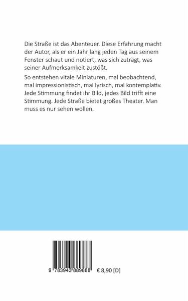 Die Straße ist das Abenteuer. Diese Erfahrung macht der Autor, als er ein Jahr lang jeden Tag aus seinem Fenster schaut und notiert, was sich zuträgt, was seiner Aufmerksamkeit zustößt. So entstehen vitale Miniaturen, mal beobachtend, mal impressionistisch, mal lyrisch, mal kontemplativ. Jede Stimmung findet ihr Bild, jedes Bild trifft eine Stimmung. Jede Straße bietet großes Theater. Man muss es nur sehen wollen.