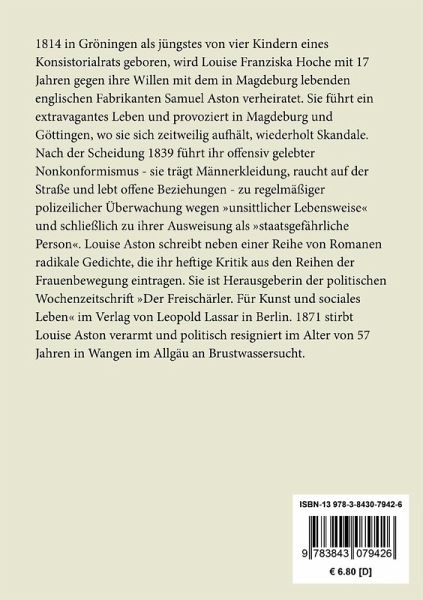 1814 in Gröningen als jüngstes von vier Kindern eines Konsistorialrats geboren, wird Louise Franziska Hoche mit 17 Jahren gegen ihre Willen mit dem in Magdeburg lebenden englischen Fabrikanten Samuel Aston verheiratet. Sie führt ein extravagantes Leben und provoziert in Magdeburg und Göttingen, wo sie sich zeitweilig aufhält, wiederholt Skandale. Nach der Scheidung 1839 führt ihr offensiv gelebter Nonkonformismus - sie trägt Männerkleidung, raucht auf der Straße und lebt offene Beziehungen - zu regelmäßiger polizeilicher Überwachung wegen "unsittlicher Lebensweise" und schließlich zu ihrer Ausweisung als "staatsgefährliche Person". Louise Aston schreibt neben einer Reihe von Romanen radikale Gedichte, die ihr heftige Kritik aus den Reihen der Frauenbewegung eintragen. Sie ist Herausgeberin der politischen Wochenzeitschrift "Der Freischärler. Für Kunst und sociales Leben" im Verlag von Leopold Lassar in Berlin. 1871 stirbt Louise Aston verarmt und politisch resigniert im Alter von 57 Jahren in Wangen im Allgäu an Brustwassersucht.