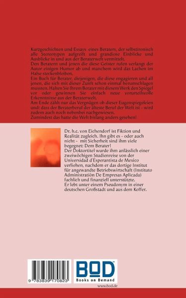 Kurzgeschichten und Essays eines Beraters, der selbstironisch alle Stereotypen aufgreift und grandiose Einblicke und Ausblicke in und aus der Beraterwelt vermittelt.Den Beratern und jenen die diese Geister rufen verlangt der Autor einigen Humor ab und manchem wird das Lachen im Halse steckenbleiben. Ein Buch für Berater, diejenigen, die diese engagieren und all jenen, die sich mit dieser Zunft schon einmal herumschlagen mussten. Halten Sie Ihrem Berater mit diesem Werk den Spiegel vor oder gewinnen Sie einfach neue vorurteilsvolle Erkenntnisse aus der Beraterwelt. Am Ende zählt nur das Vergnügen ob dieser Eugenspiegeleien und: dass der Beraterberuf der älteste Beruf der Welt ist - wird zudem auch noch nebenbei nachgewiesen. Zumindest das hatte die Welt bislang anders gesehen!
