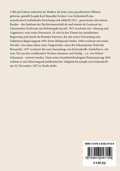 1788 auf Schloss Lubowitz bei Ratibor als Sohn eines preußischen Offiziers geboren, genießt Joseph Karl Benedikt Freiherr von Eichendorff eine aristokratisch-katholische Erziehung und schließt 1812 - gemeinsam mit seinem Bruder - das Studium der Rechtwissenschaft ab und nimmt als Leutnant im Lützowschen Freikorps am Befreiungskrieg teil. 1815 erscheint mit "Ahnung und Gegenwart" sein erstes Prosawerk. Er tritt in den Dienst der preußischen Regierung und macht als Beamter Karriere, die mit seiner Ernennung zum Geheimen Regierungsrat 1841 ihren Höhepunkt findet. 1826 erscheint mit seiner Novelle "Aus dem Leben eines Taugenichts" einer der bekanntesten Texte der Romantik. 1837 erscheint die erste Sammlung von Eichendorffs "Gedichten", die zum Teil aus den erzählenden Werken stammen und häufig - u.a. von Robert Schumann - vertont werden. Nach seiner krankheitsbedingten Pensionierung 1844 widmet er sich überwiegend publizistischer Tätigkeit bis Joseph von Eichendorff am 26. November 1857 in Neiße stirbt.