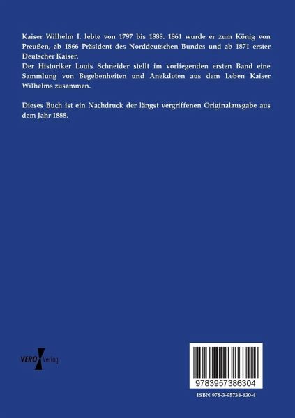 Der Historiker Louis Schneider stellt im vorliegenden ersten Band eine Sammlung von Begebenheiten und Anekdoten aus dem Leben Kaiser Wilhelms zusammen.